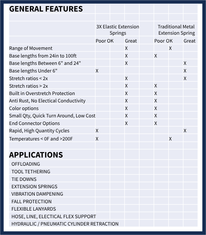 Adjustable Length Springs / Tie Downs New category Elastic Base length 8 inches to 100ft. Overall length 200 yards 3x with 4x potential 3 to 150 lbs Yes Flexible Yes Yes Dozens of options No Medium No